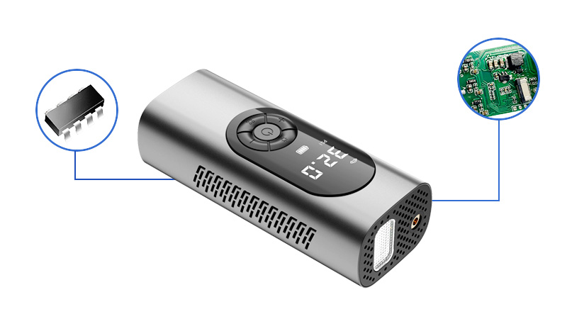 便攜式車載打氣泵主要由驅(qū)動(dòng)電機(jī)、氣壓傳感器、LED屏幕、控制電路等模塊組成,主控電路MCU接收測(cè)壓信息,控制電機(jī)轉(zhuǎn)速,從而調(diào)整充氣量與充氣速度。一鍵預(yù)設(shè)功能,接上氣嘴后,自動(dòng)檢測(cè)胎壓情況,充滿自動(dòng)停止,和手動(dòng)充氣相比,省去了繁瑣的步驟又節(jié)省了體力。